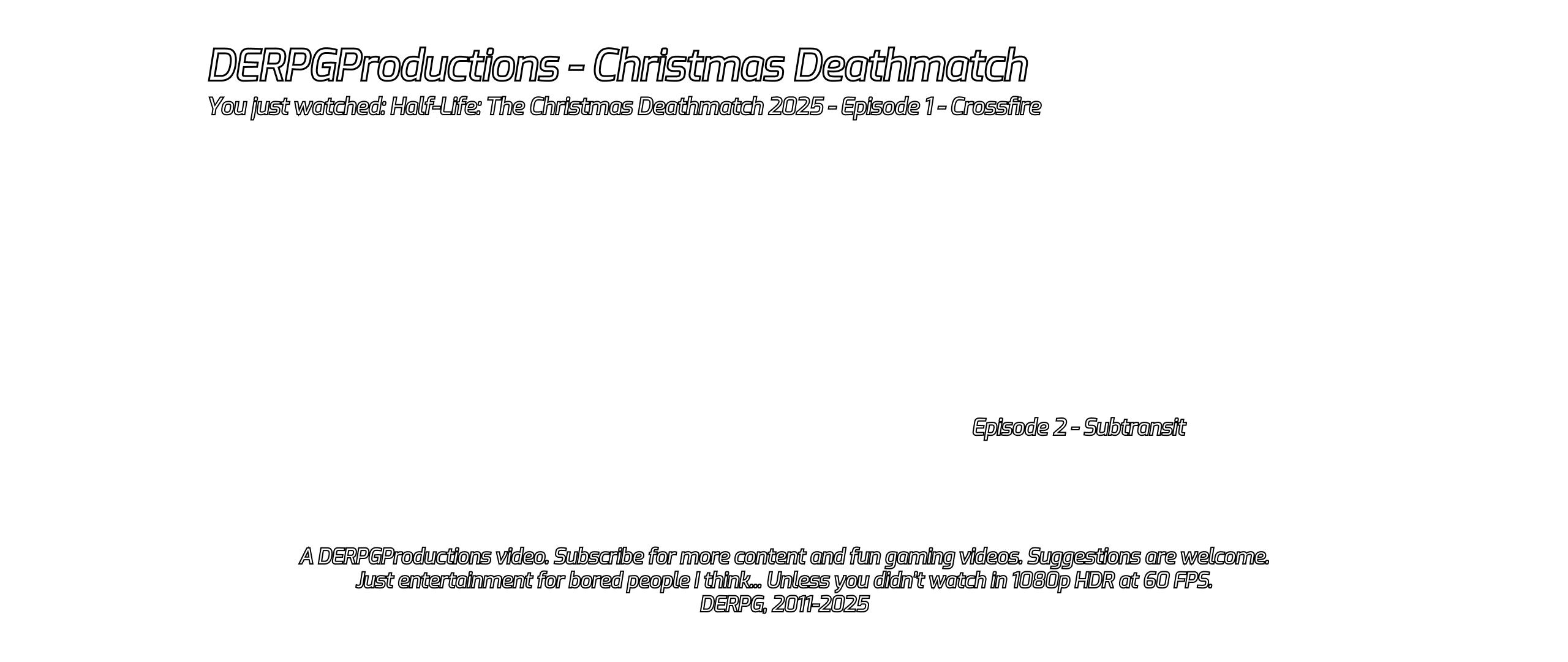 This project is not done yet. I have the POVs from everyone and plan to make a multi-POV mash of all of the perspectives throughout the Christmas Deathmatch 2025. That way, you can see all of the chaos from all people involved. Obviously this would take much more time to produce. I plan on releasing a blog post soon with the history of DERPG collaborations and multi-perspective recordings. It will detail my work on this very project for the Christmas Deathmatch 2025 as well.